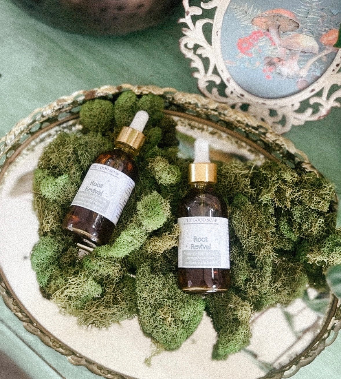 Root Revival Hair Oil is a nutrient‑rich blend designed to support hair growth, strengthen roots, and restore scalp health. This powerful formula combines deeply moisturizing oils with herbal infusions and essential oils to awaken follicles and encourage thicker, healthier strands. As you massage this oil into your roots and scalp, you'll feel a minty tingle that boosts circulation, stimulates follicles, and supports healthy hair growth.